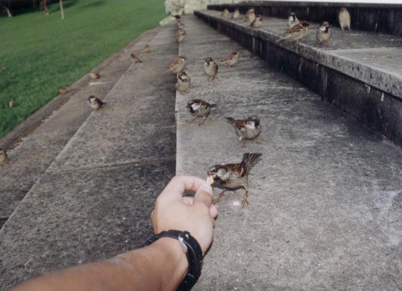 近くのベンチなどで食べていると、いつのまにかたくさんのスズメがあなたのアイスのおこぼれを狙って集まってくるはずです。近くに寄ってきたら、コーンを小さくちぎって差し出してみましょう。日本では考えられませんが、図々しいスズメがあなたの手から直接コーンを食べにきますよ。
