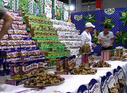 試食のほかに、無料サンプルを配っていたり、販売もありますので、こんなにたくさん持ち帰る人もいます。