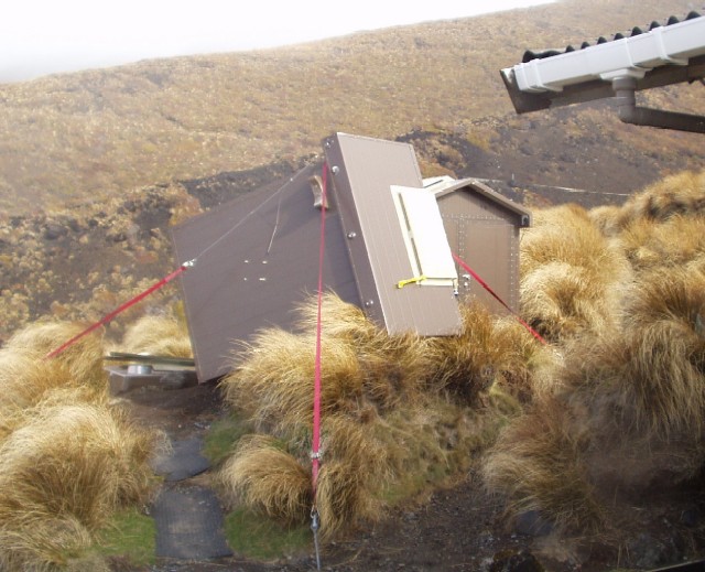強風のため倒壊したままのトイレ。後ろにもう一つのトイレが見えます。