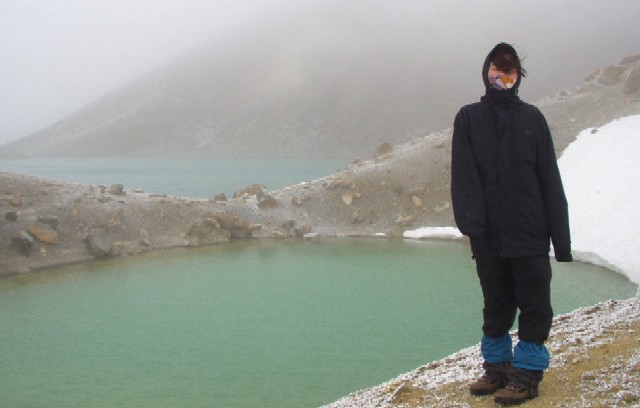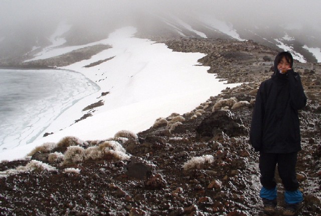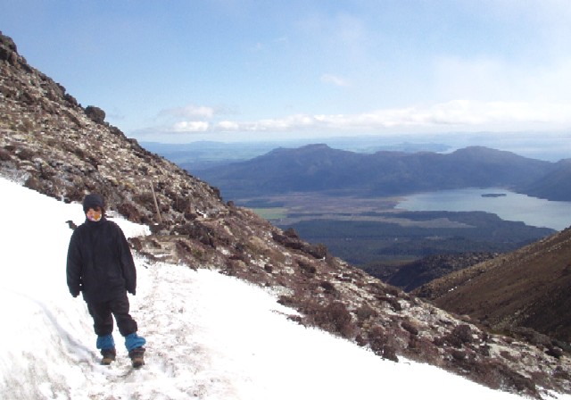 山小屋への帰り道。雪深いカルデラの反対側には、結氷したカルデラ湖「ブルー・レイク」があります。